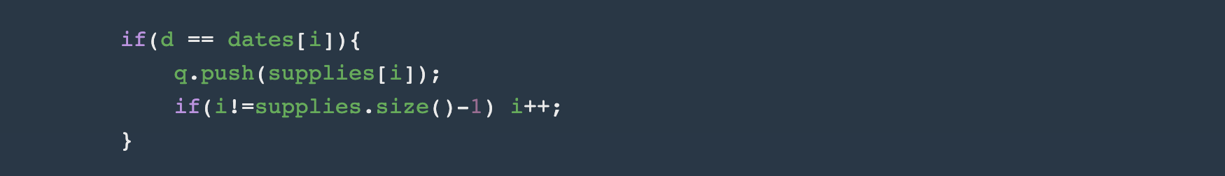 2) 공급가능한날에 도달하면 현재 공급가능한 밀가루량을 사용해서 queue.push(공급가능일이 되면 해당 공급가능일에 공급받을 수 있는 밀가루량); 해줍니다. (공급량, supplies[i] 사용 후, i++로 다음 공급가능한 날을 비교할 준비를 한다.)
