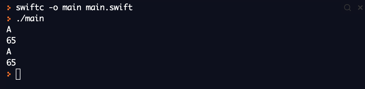 그 결과는 아래와 같습니다. (unicodeScalar.first!.value / asciiValue 순)