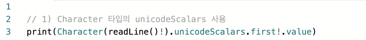이게 저번에 소개하지 못한 ascii 코드 값 출력 방법입니다. 저번에 소개했던 asciiValue를 통한 아스키코드 출력방법은 실제로는 위의 unicodeSclars를 통해 출력하는 방법의 래퍼라고 합니다. 코드 길이는 다소 길어지지만, 속도는 asciiValue보다 빠른 방법이라고 할 수 있습니다. 그렇다고 문제풀이 큰 지장을 초래할 정도의 성능차이는 아니라고 생각합니다.