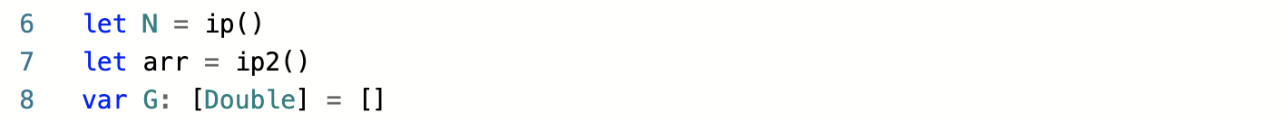 3 ~ 4행) ip, ip2 클로져 상수는 각각 입력받아 정수변환, [Character] 배열 변환을 해서 반환해주는 클로져를 저장합니다. 중복된 입력을 수행할 때 이와 같이 상수를 정의해두면 보다 짧은 코드로 입력을 처리할 수 있어서 이렇게 사용해봤습니다.
