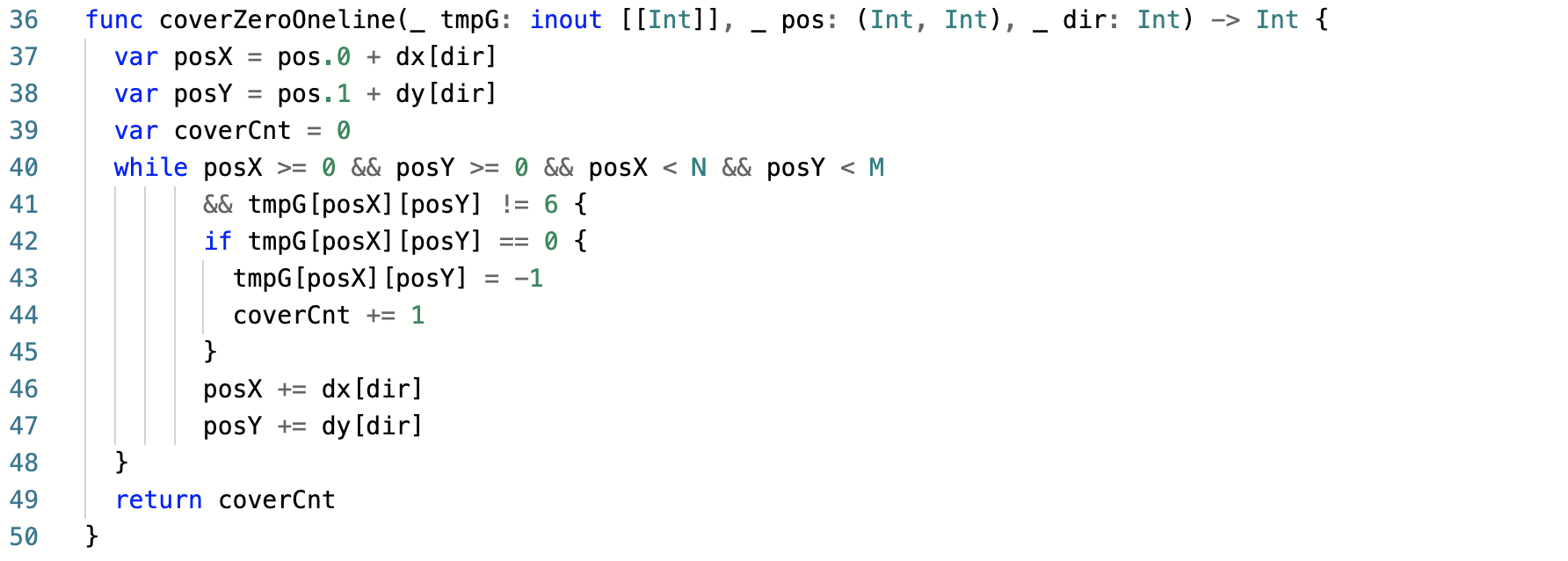 위 코드는 ,cctv로 감시가능했던 빈 공간에 감시했음을 표시함과 동시에 감시가능했던 공간의 크기를 반환하는 함수, coverZeroOneline입니다.