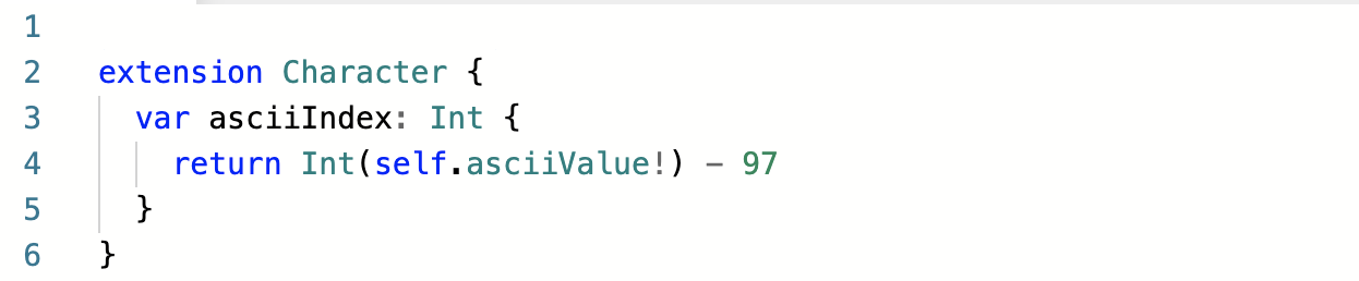 3 ~ 5행) asciiIndex는 특정 문자의 소문자 알파벳에 대한 아스키값을 토대로 알파벳 고유 인덱스를 반환하는 프로퍼티입니다. 그 반환갑은 a -> 0, b -> 1, c -> 2 .... 와 같은 식으로 결과값을 반환하게 됩니다.