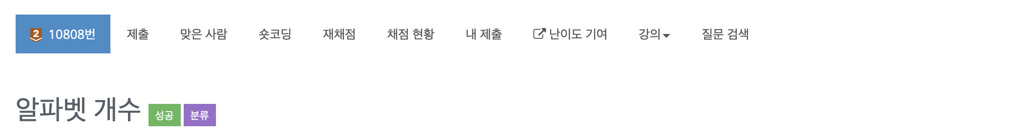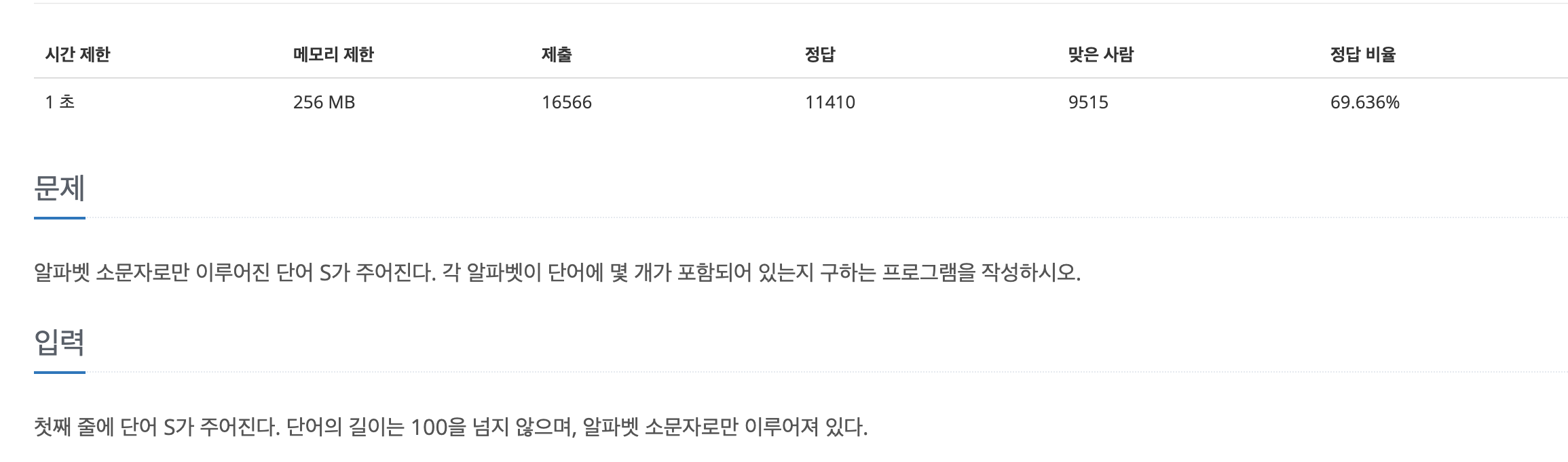 백준 10808번, 알파벳 개수는 입력받은 문자열의 a, b, c .... y, z 까지의 각 알파벳 개수를 출력하는 문제입니다.
