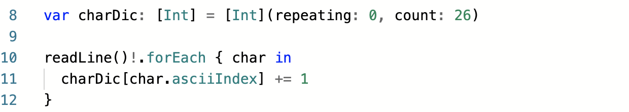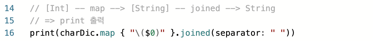 이제 카운팅이 완료되었습니다. charDic은 [Int]타입의 배열이라 이대로 공백단위 출력하기는 어렵습니다. 이를 출력하기 쉽게 변환하는 작업을 거치겠습니다.