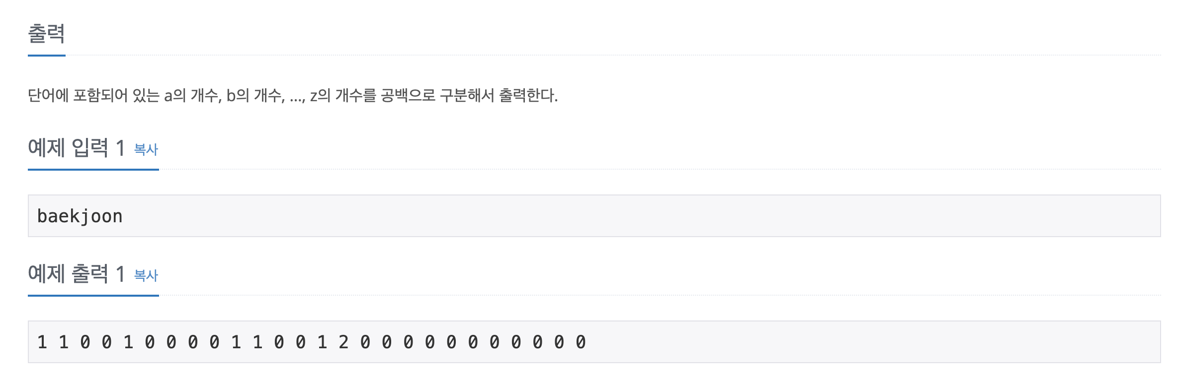출력예시를 보시면 a ~ z까지의 각 알파벳 문자 갯수를 출력하고 있습니다. 저는 문자열을 입력받은 후, 문자열의 문자를 하나하나 배열에 카운팅 기록한 후, 배열의 카운팅 값을 출력하는 방식으로 문제를 풀 예정입니다.