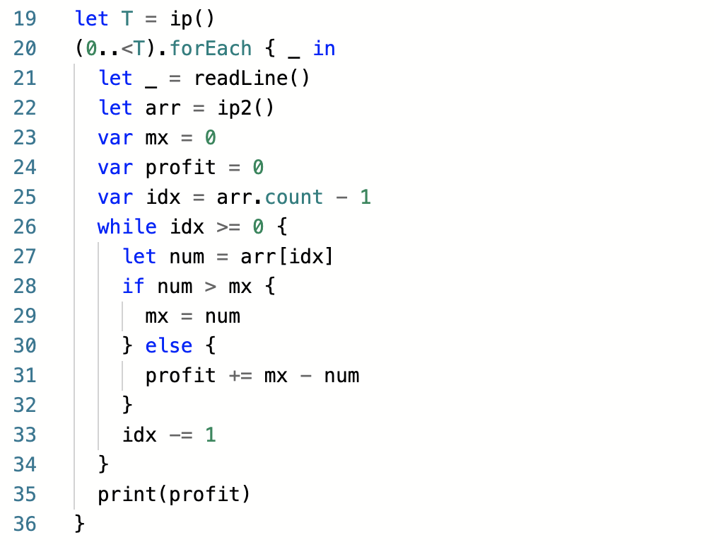 역순 순회를 하면서 최대 가격이 나오면 mx에 갱신을 해주고, 만약 최댓값이 아니라면, profit에 mx - num을 누적시켜줍니다..