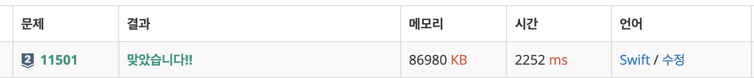 본 문제의 시간제한은 5초이지만 보다 효율적인 실행시간에 문제를 풀기 위해 입력 최적화 함수를 작성해두었습니다. 백준알고리즘 문제는 간혹 swift에 대한 시간보정이 되어있지 않아서 요즘은 이렇게 풀고 있습니다.