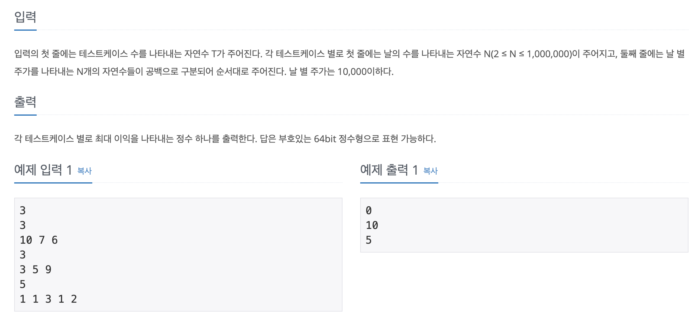 본 문제는 여러개의 테스트케이스가 존재할 수 있습니다. 가장 첫 줄에 T가 입력되고, T번의 케이스에 대해 최대 이익을 출력하면 됩니다. 주식 날의 수를 나타내는 자연수 N의 범위는 백만이므로, O(N^2) 미만의 시간복잡도를 고려해봐야 겠습니다.