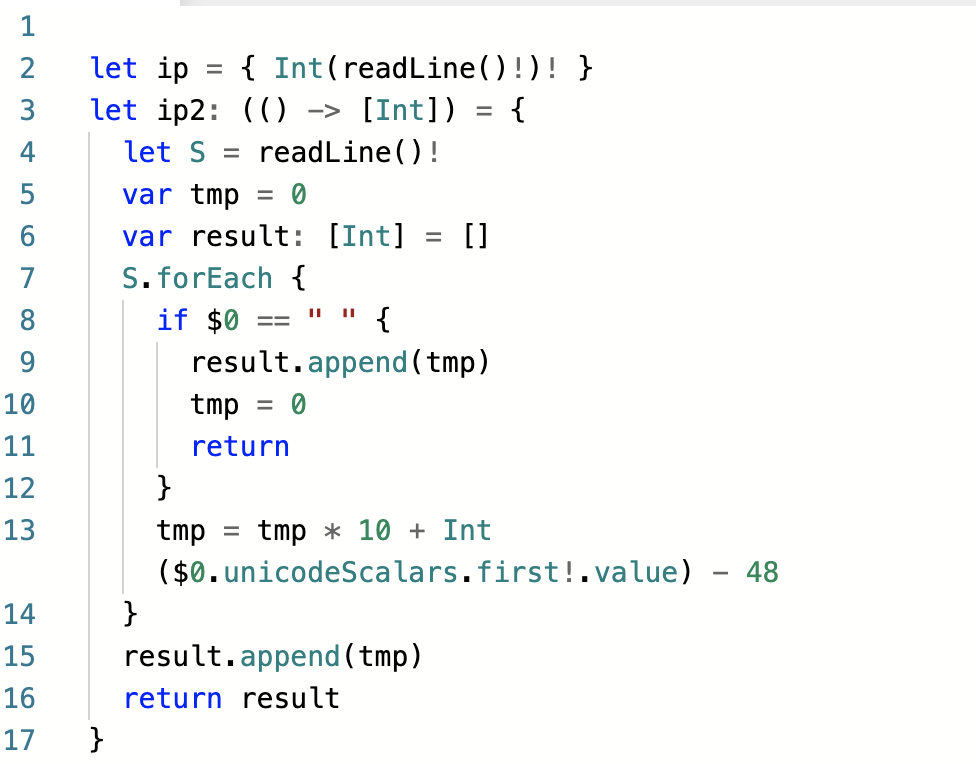 3 ~ 17행) ip2는 입력 최적화를 적용한 함수로, 1라인 입력값으로부터 공백 단위로 정수를 모아 [Int]타입의 배열로 반환해줍니다.