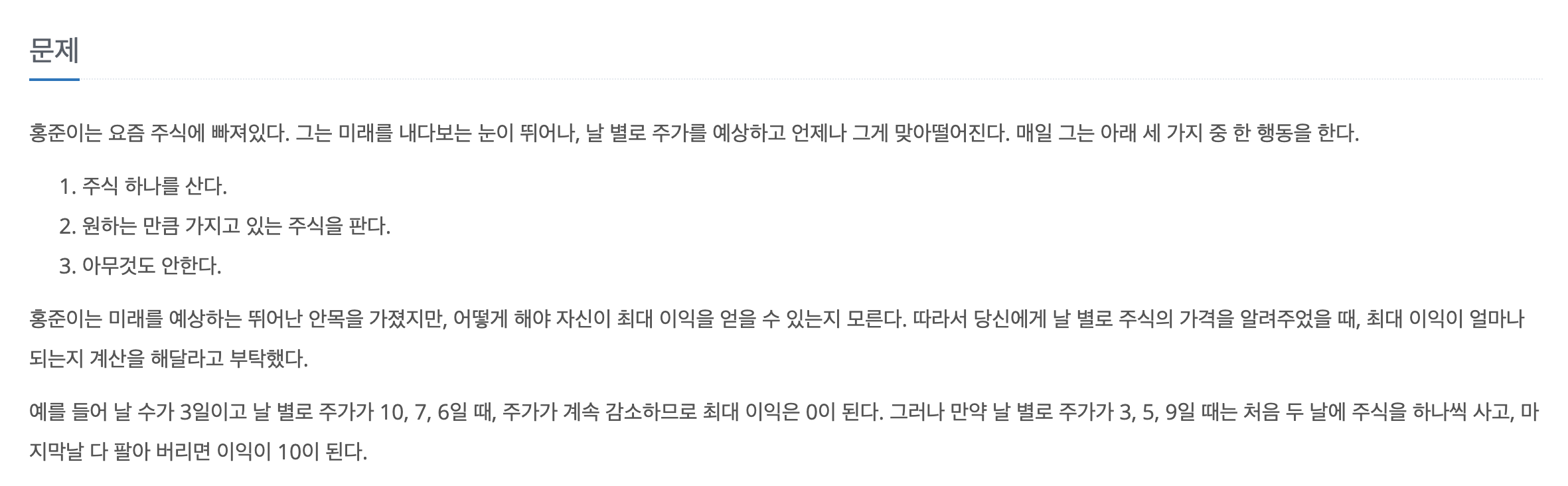 해당문제는 한 라인에 주식의 가격이 주어질때 최대한 큰 수익을 낼 수 있도록 하는 것입니다. 주식 매매에 있어서 할 수 있는 행동은 크게 3가지입니다.