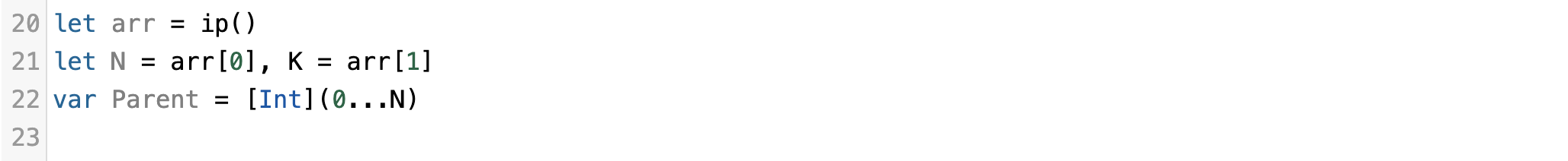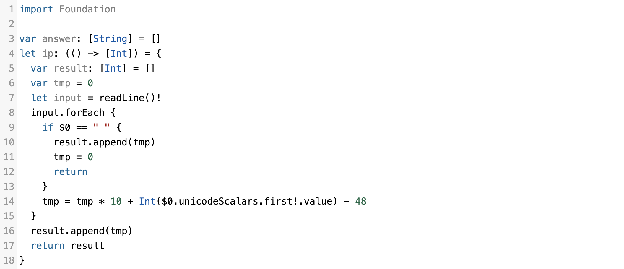 4 ~ 17행) 보다 빠른 성능으로 문제를 풀기위해 구현한 입력 최적화 구현 코드입니다. 한줄 입력을 받았을때 입력받은 문자열 String을 [Int] 타입의 배열로 반환해주는 클로져 함수 ip입니다.