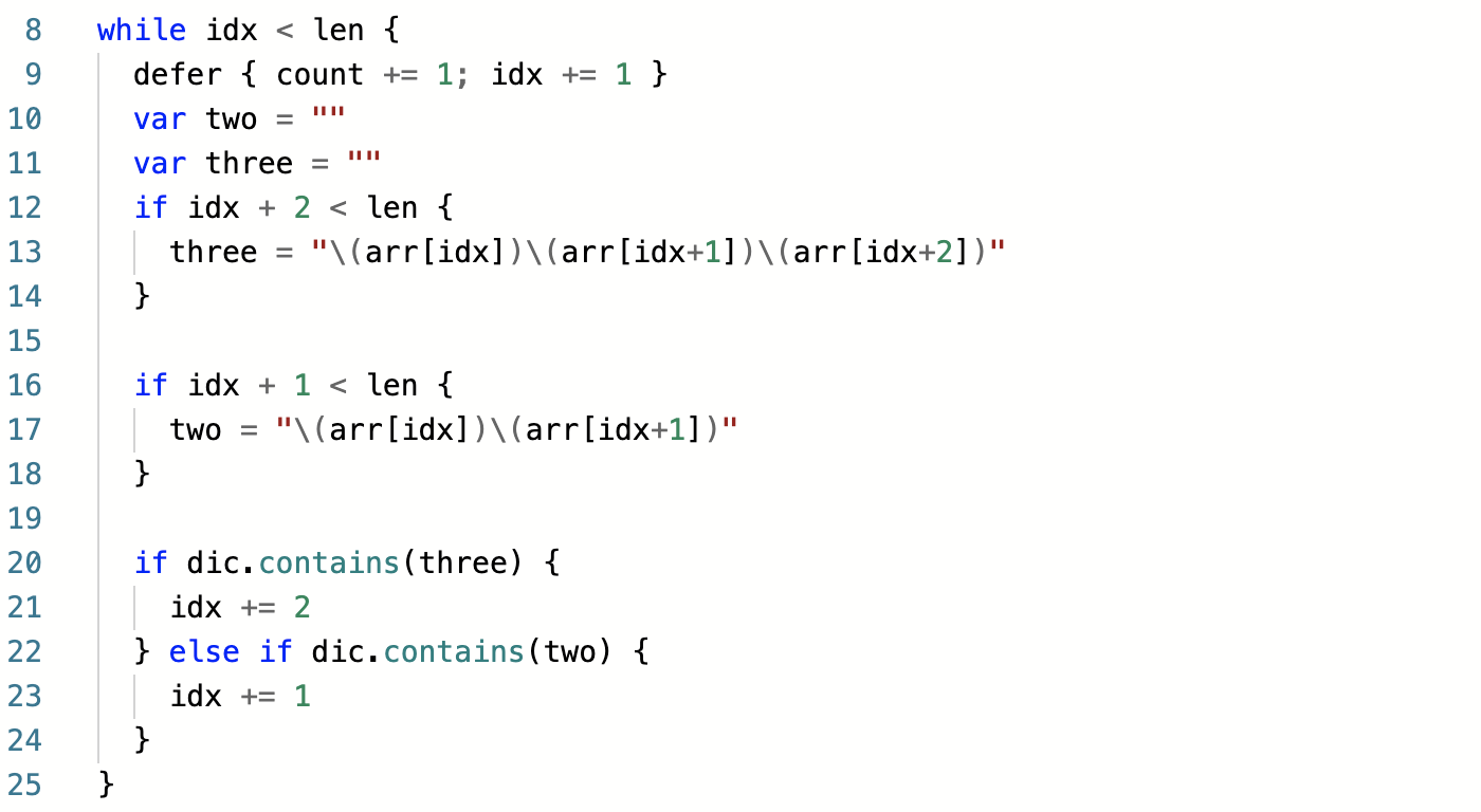 만약 2 / 3자리의 크로아티아 알파벳이 없었다면 현재 탐색중인 arr[idx] 문자는 문자 하나를 크로아티아 알파벳으로 간주해야 합니다. 이 경우에도 알파벳 카운팅을 합니다. 그 부분은 앞서 말한 defer { ... } 부분에서 공통적으로 카운팅 연산을 수행합니다.