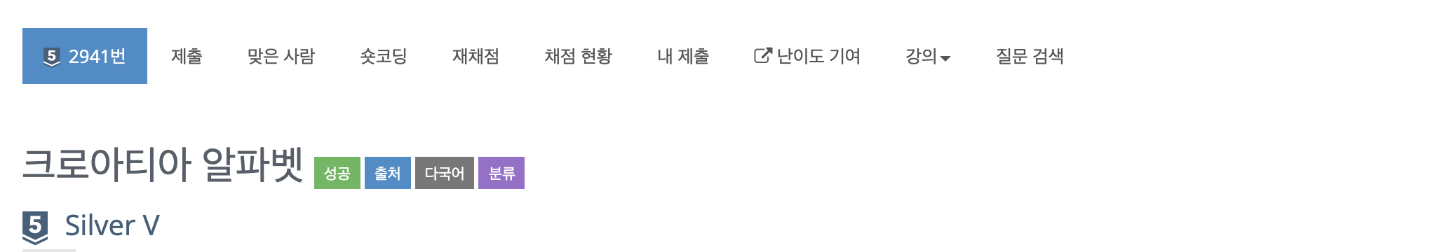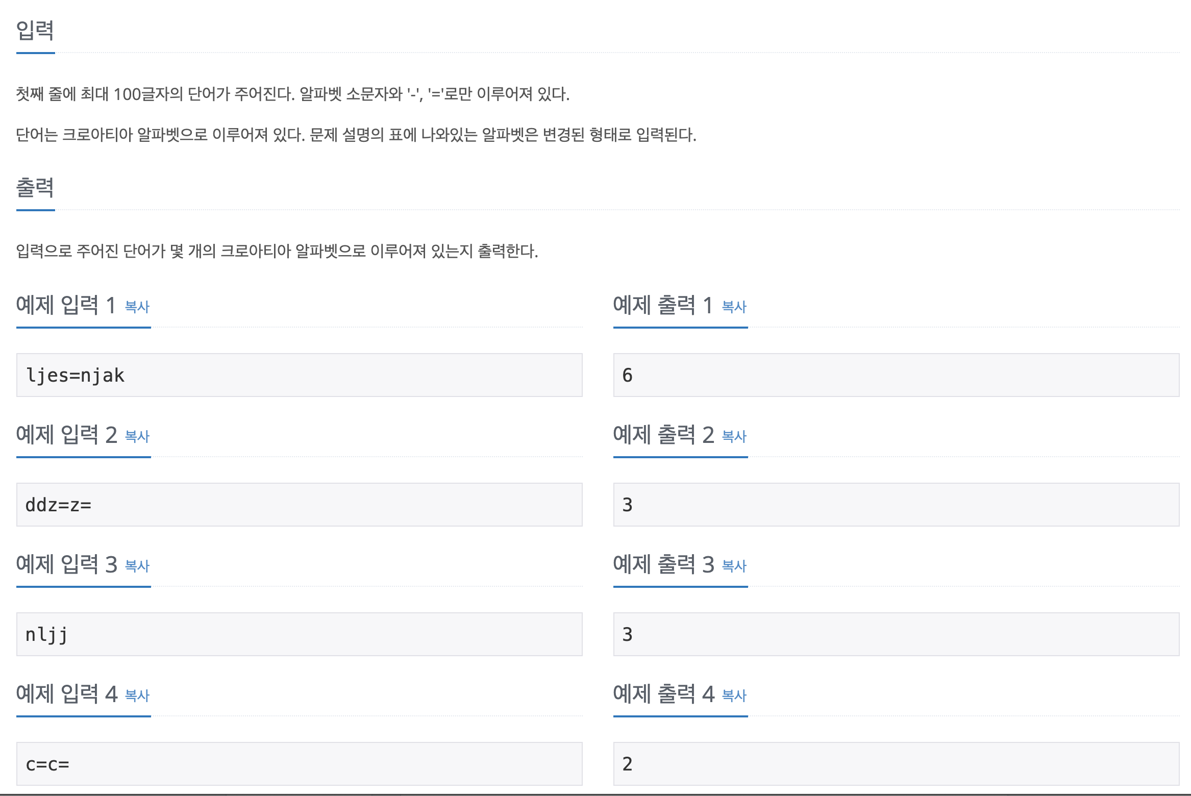 백준 2941번, 크로아티아 알파벳은 입력받은 문자열의 크로아티아 알파벳 갯수를 출력하는 기초문제입니다.
