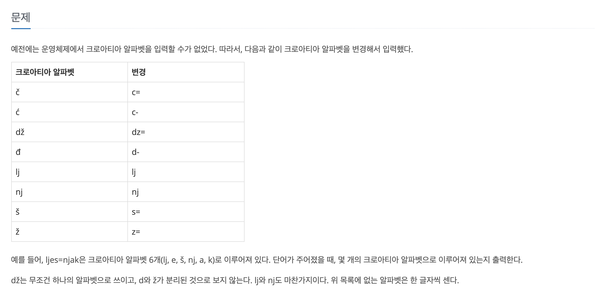 크로아티아 알파벳은 우측 변경 열의 문자열을 기준으로 확인하면 됩니다. 위 표에 있는 문자열은 여러개의 문자로 이루어 졌을지라도 하나의 알파벳으로 인식해야합니다. 또한 표에 없는 문자는 문자하나당 알파벳 한개로 인식하면 됩니다.