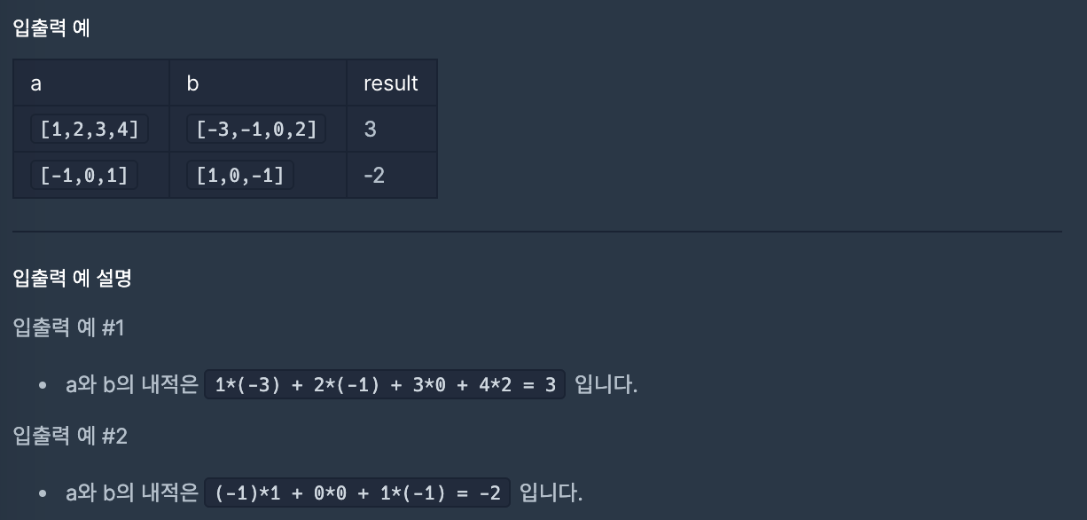 프로그래머스 레벨1문제, 내적문제는 동등한 크기의 배열 두개(a, b)가 주어졌을때 a, b의 내적을 구하는 문제입니다. 배열 동일위치 값을 각각 곱한 후 이들의 합을 구하는 간단한 문제입니다. 문제 설명대로 풀면 됩니다.