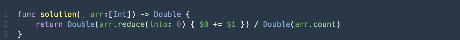 reduce(into:)를 사용해서 작성한 코드입니다. into: 인자로 0 초기값을 설정하고, 배열의 모든 숫자의 누적합을 저장하고, arr 크기로 나누어서 배열의 평균값을 반환합니다. reduce를 다른 형태로 활용해서 좀더 간결하게 풀 수도 있습니다.