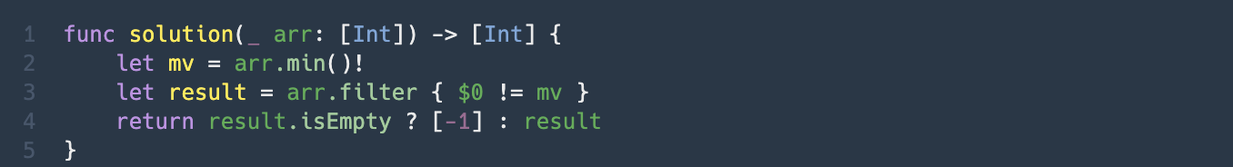 제일 작은 수 제거하기 문제는 [Int] 타입의 정수형 배열이 주어졌을때 가장 작은 수를 제외한 배열을 배열 순서를 유지한채 반환하는 문제입니다. 만약 가장 작은 수를 제외했는데 빈 배열일 경우, [-1] 을 반환해야한 다는 점을 유의해서 문제를 풀면 되겠습니다.