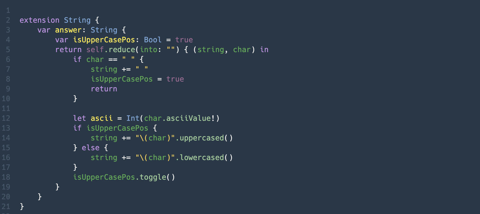 할때 사용할 수 있는 코드인데 넘어가주세요 ㅎㅎ 본 문제를 푸는데 필요없는 코드입니다. 이어서 isUpperCaedPos의 true/false 여부에 따라 대문자/소문자로 변형시켜줍니다. 대/소문자 변형은 String타입의 uppercased(), lowercased()를 통해 쉽게 적용할 수 있습니다. 이후 각 단어의 대문자 다음은 소문자 / 소문자 다음은 대문자가 와야 하므로 isUpperCasePos를 토글 시켜줍니다.
