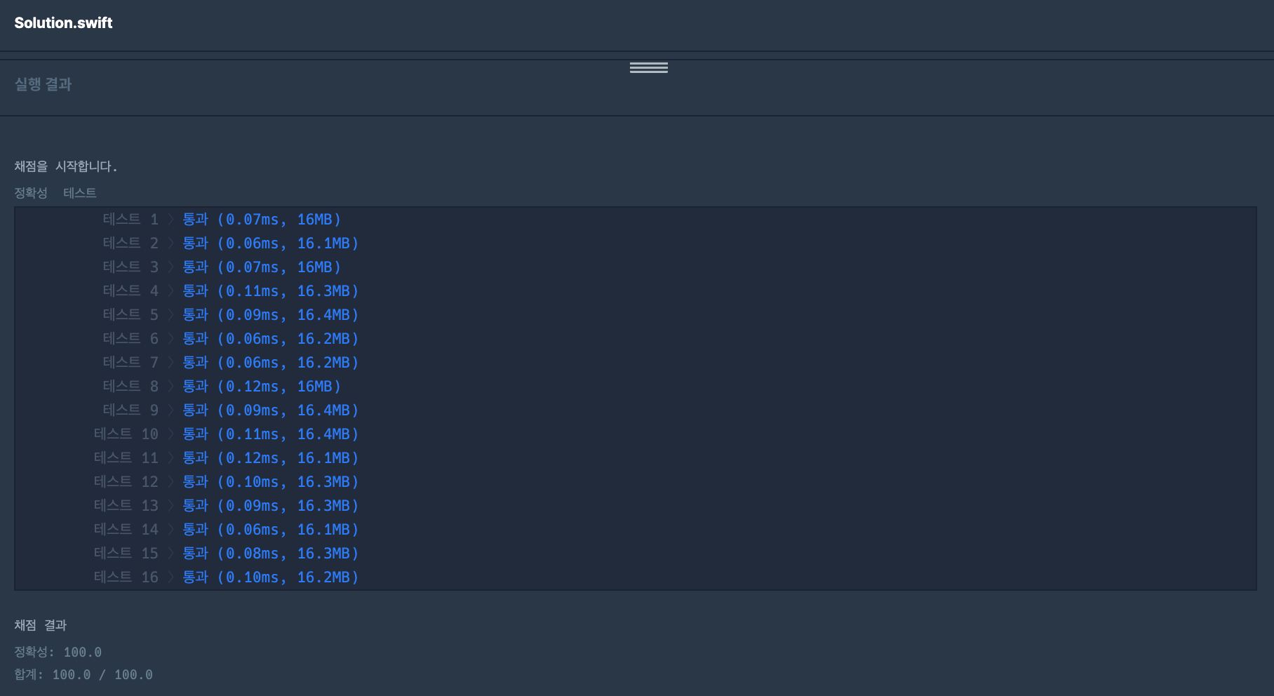 본 문제, 이상한문자 만들기 제출결과 & 작성한 swift 전체코드는 아래와 같습니다.