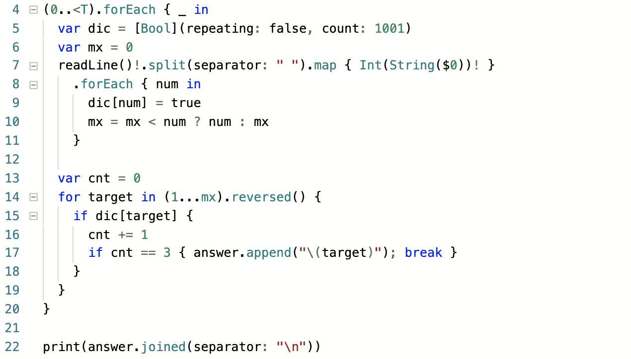 | 스위프트 다중 for 반복문 문법 예제, 백준 2798 블랙잭 풀이 (0) | 2021.02.22 |