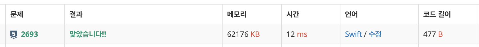 이렇게 swift언어와 계수정렬을 활용해서 문제를 풀 수 있었습니다. 아래에 제출결과 및 소스코드 첨부드리겠습니다. 참고하시기 바랍니다.