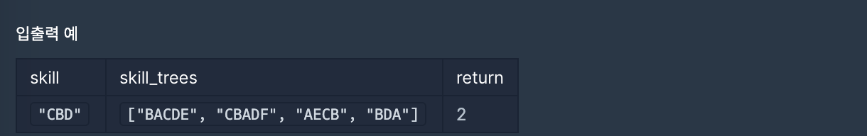 스킬트리문제는 스킬과 스킬트리 리스트가 주어졌을때 유효한 스킬트리가 몇개인지를 구하는 문제입니다.