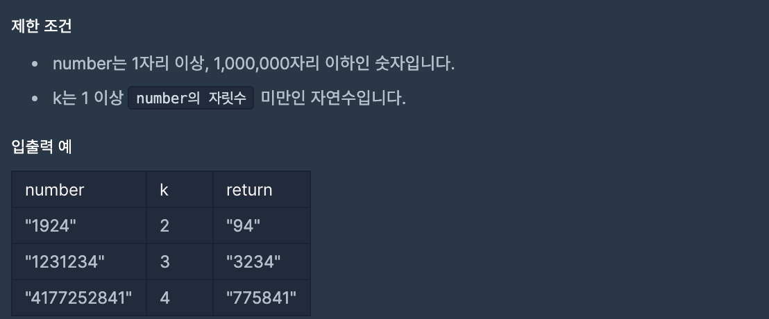 프로그래머스 2단계문제인 큰 수 만들기 문제는 number에서 k개의 숫자를 제거해서 최대 숫자를 구하는 문제입니다.