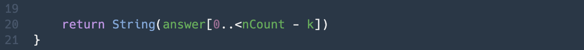 앞서 순회를 통해서 K제거했을때의 가장 큰 숫자가 만들어 집니다. 이렇게 최종적으로 만들어지는 문자열의 길이는 nCount - K 여야 합니다. nCount - K 길이의 [Character] 배열을 String 생성자의 인자로 사용해서 String 문자열로 합칠 수 있습니다. 이렇게 그대로 정답 문자열을 반환하며 코드는 종료합니다.