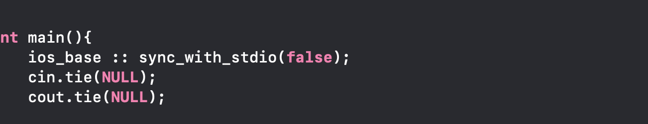 cin, cout 코드 최적화 코드는 위와 같습니다. 단 3줄이면 cin,cout을 사용 시 실행속도가 크게 좋아질 것입니다. cin,cout을 쓰는걸 권장은 못하겠습니다만 사용하실거라면 꼭 알아두시면 좋은 cin,cout c++언어 입출력 최적화 코드입니다.