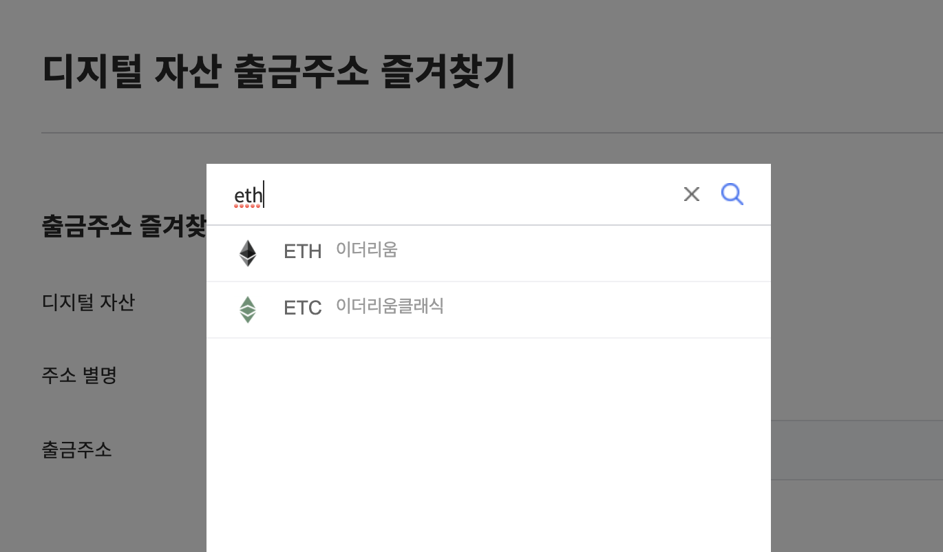 이더리움 출금주소를 등록하고자 한다면, ETH로 검색하면 되겠네요. 그렇게 검색을 하고, ETH를 선택해줍니다.