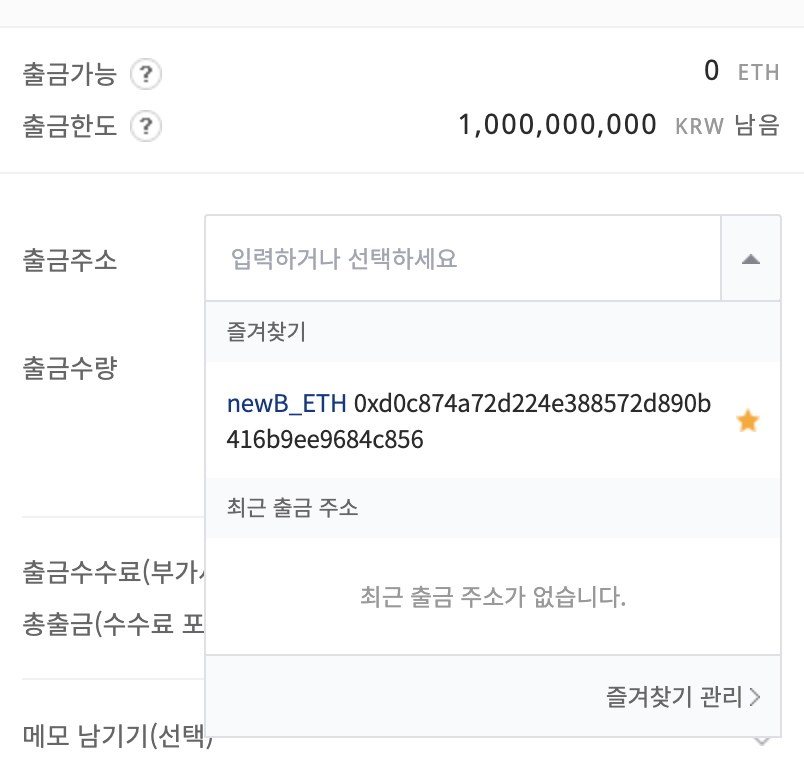 화살표를 누르면 최근 출금했던 주소, 즐겨찾기 주소목록을 확인할 수 있습니다. 즐겨찾기 등록을 하신적이 없다면, 즐겨찾기 목록이 비어있을 거에요. 해당 가상화폐에 대한 출금주소를 관리하기 위해 우측 하단의 [즐겨찾기 관리] 를 선택해줍니다.