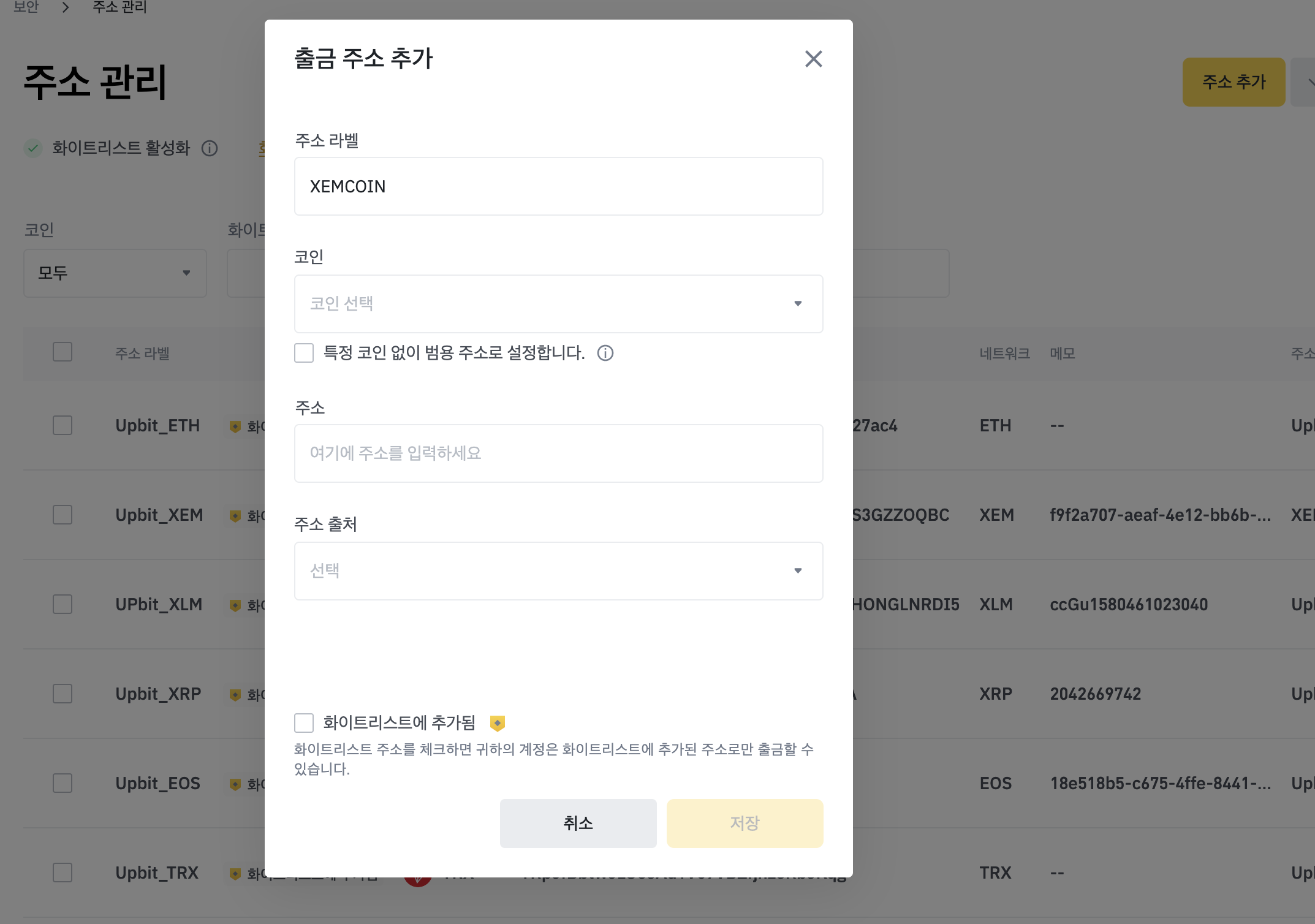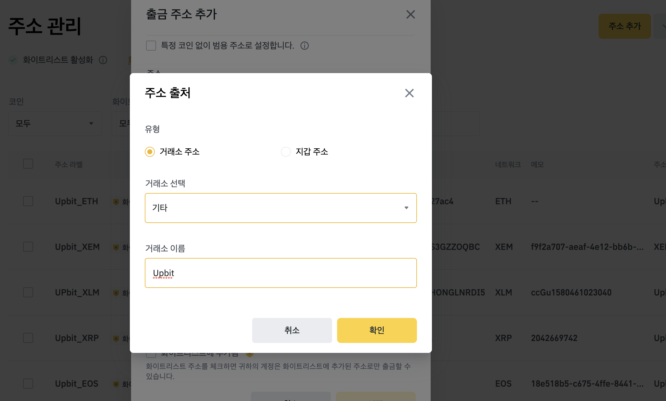 주소 출처도 적어줍니다. 업비트와 같이 검색목록에 없는 거래소는 위와 같이 기타 - Upbit 와 같이 등록할 수 있겠습니다.