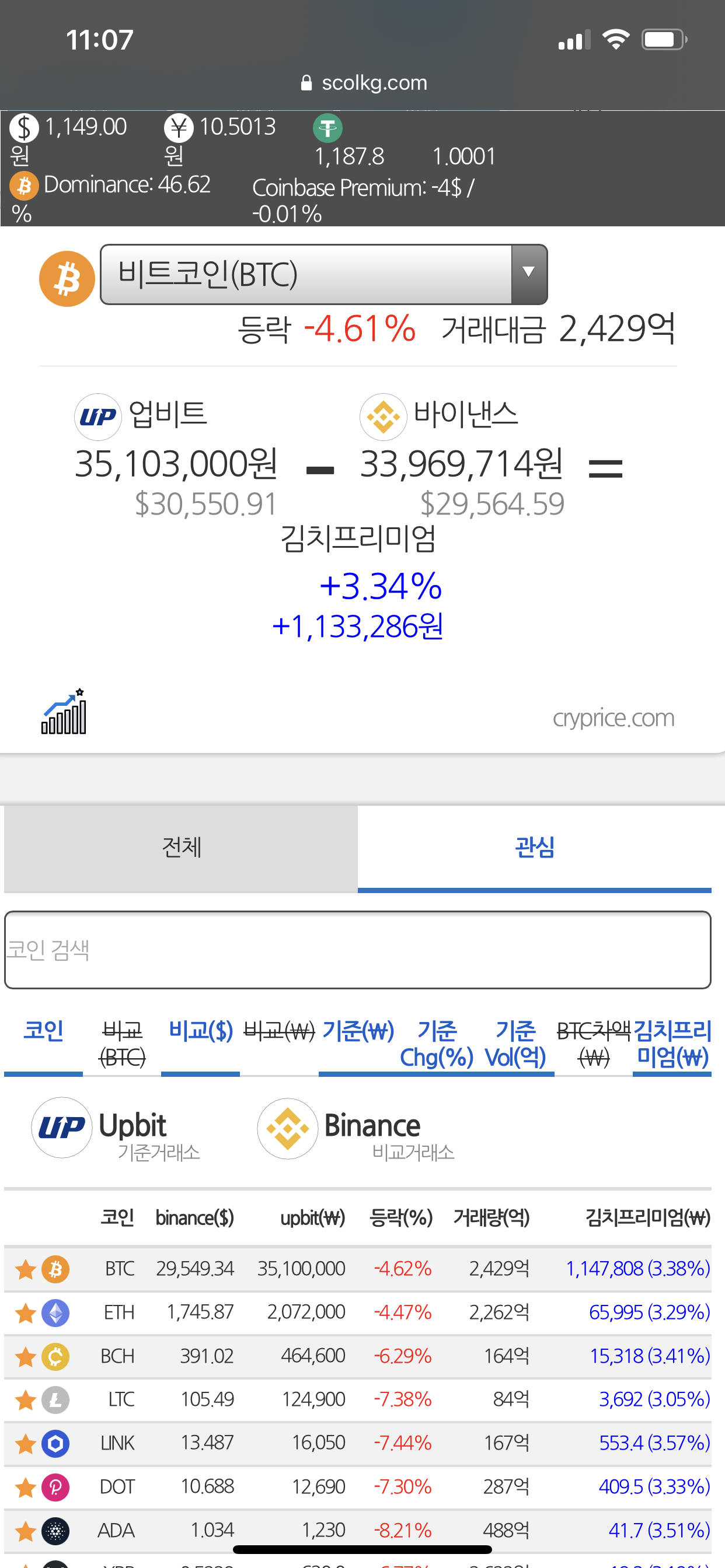 scolkg.com 웹사이트는 국내 거래소에 있는 원화마켓 가상화폐에 대한 김치프리미엄 정보를 한눈에 확인할 수 있고, 이중에서 원하는 코인만 선택적으로 즐겨찾기 설정할 수도 있습니다. 관심 탭을 통해서 원하는 코인들의 김프 정보만 확인할 수도 있습니다.