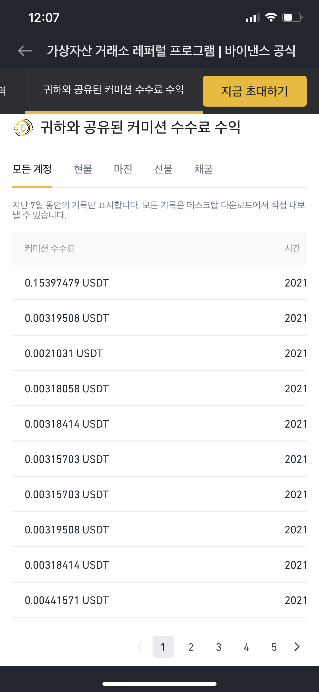 웹사이트와 동일하게 레퍼럴 메뉴 페이지 최하단으로 스크롤 하시면 커미션 수수료 공유수익 페이지가 있으니 확인하시면 됩니다.