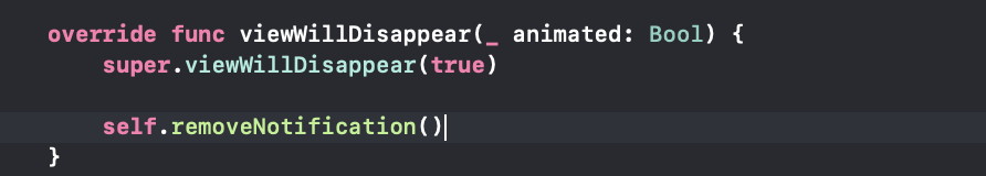 이제 removeNotification, setNotification 메서드를 viewWillAppear, viewWillDisappear에 적절하게 배치하면 됩니다.