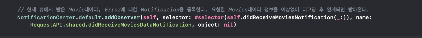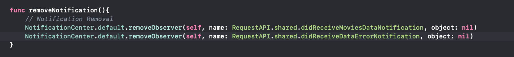 노티피케이션 옵저버를 제거(removal)하기 위한 코드입니다. 매우 간단하게 NotificationCenter를 접근, 특정 옵저버 이름을 지정하여 제거하면 됩니다.