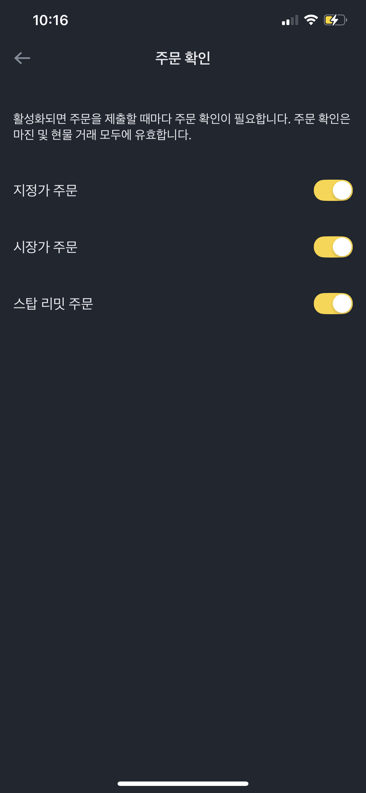 환경설정 페이지를 들어가시면 [주문 확인] 메뉴가 있습니다. [주문 확인] 메뉴를 들어가면 [지정가 주문 / 시장가 주문 / 스탑 리밋 주문] 등에 대한 토클 버튼이 존재할 거에요. 각각의 옵션을 자신의 취향에 맞게 설정하시면 됩니다. 활성화를 시키면, 매수, 매도를 진행할때 주문확인 팝입이 발생하게 되어서 매매 실수를 좀더 줄일 수 있게 됩니다.