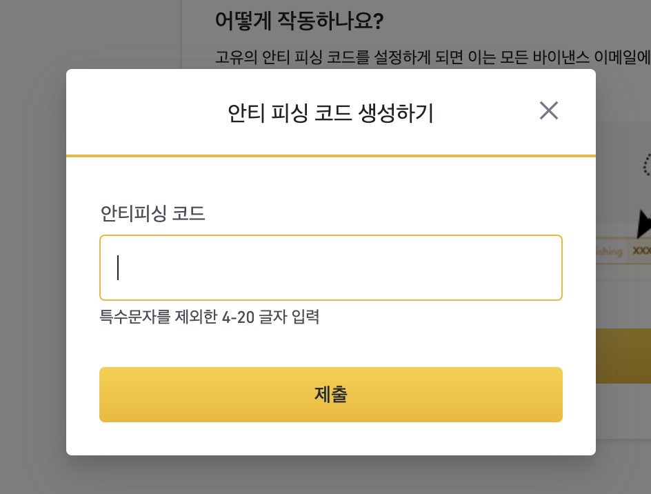 이제 바이낸스 메일에 기입되는 식별코드를 생성하시면 됩니다. 본인이 자유롭게 안티피싱 코드를 생성할 수 있습니다. 특수문자 제외 4 ~ 20글자를 입력해서 [제출] 버튼을 눌러줍니다.