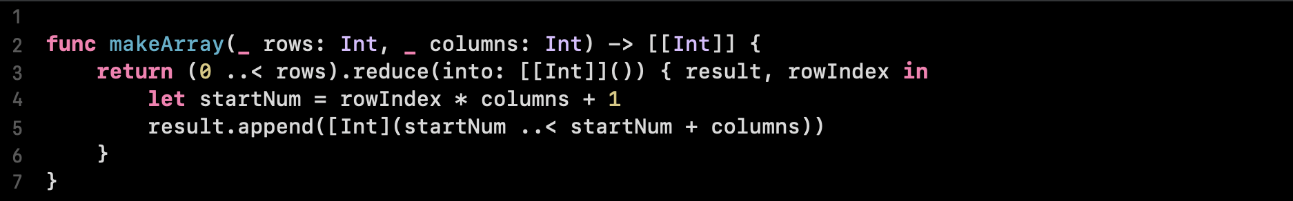 func makeArray(_ rows: Int, _ columns: Int) -> [[Int]] {