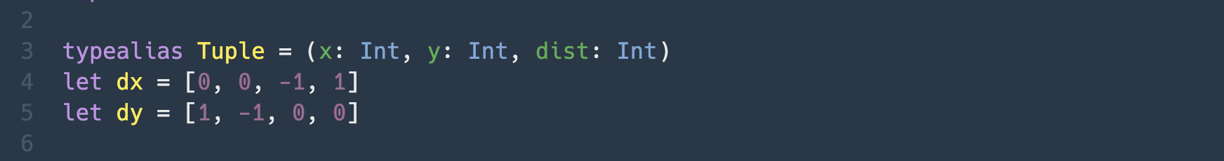 3행) BFS 탐색 중 큐 타입으로 사용할 Tuple 타입을 정의했습니다. x, y좌표와 맨해튼 거리 준수여부를 체크할 dist 거리변수를 두었습니다.