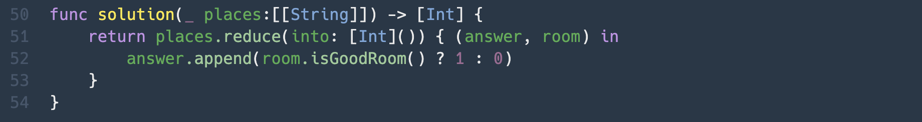 51 ~ 53행) places배열에 reduce 연산자를 사용하여 각각의 맵의 거리두기 실천여부를 확인하고, 실천하는 경우 1 / 실천하지 않는 경우 0을 누적시킨 [Int]타입의 배열을 반환합니다. 이렇게 거리두기 확인하기 문제를 풀 수 있었습니다.