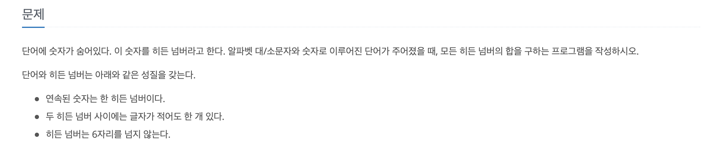 단어에 숨어있는 숫자를 찾아서 그 합을 구하는 문제입니다. 각각의 히든넘버 사이에는 글자가 적어도 하나 있습니다. 또한 히든넘버는 6자리를 넘지 않도록 입력됩니다.