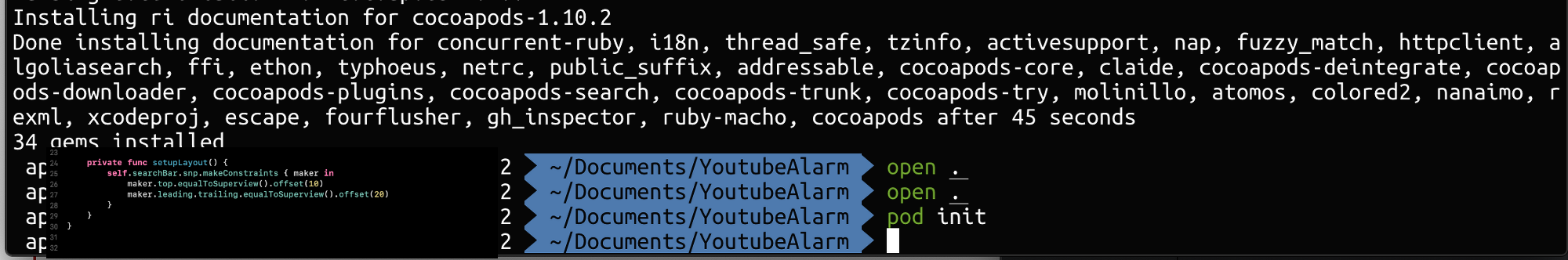 이후, 개발할 프로젝트 폴더로 들어가줍니다. cocoapods 설치를 하지 않았다면, gen install cocoapods를 통해서 코코아팟을 설치하고 시작합니다.