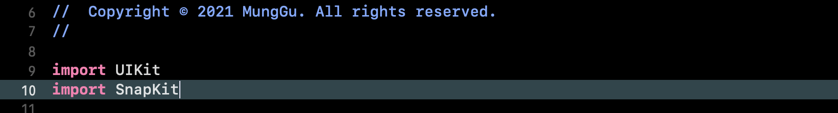 import SnapKit을 적어도 컴파일 에러가 발생하지 않습니다. 이렇게 되면 정상적으로 SnapKit 라이브러리 설치가 된 것이죠.