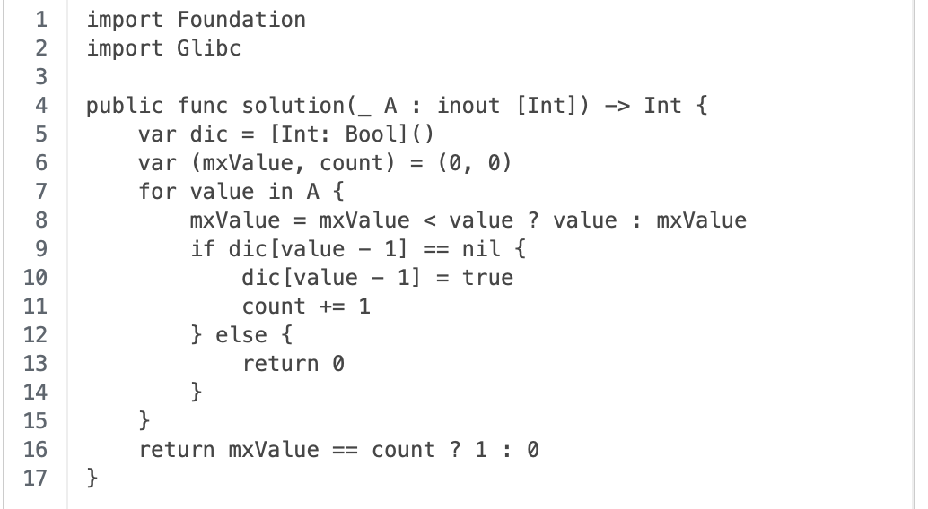 5행) 먼저 Int, Bool값을 각각 키, 값으로 갖는 딕셔너리를 선언합니다. Int 키는 배열에 있는 요소 값이 들어가며, 1 ~ N의 요소가 각각 하나씩 정상적으로 들어가 있는지를 확인합니다.