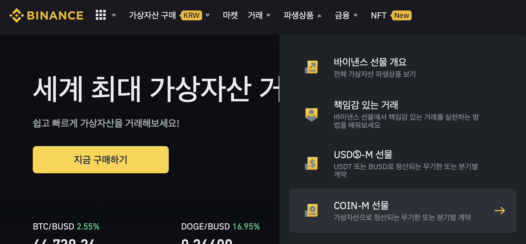 먼저 바이낸스 선물 페이지로 이동합니다. 이번 주제에서는 coin-m 선물의 펀딩비 다루는법을 다루기에 파생상품 -> [COIN-M 선물] 메뉴를 들어가줍니다.