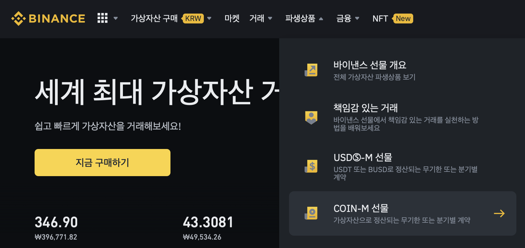 선물거래 시 BNB코인으로 수수료할인혜택을 받기 위해서는 앞서 말했듯이 선물계좌로 BNB코인을 전송해주어야 합니다. 이를 위해 먼저 바이낸스 페이지 상단 [파생 상품] -> [USDS-M 선물] 메뉴를 진입합니다. 참고로, COIN-M선물거래 시에는 BNB코인으로 거래수수료 할인을 받을 수 없습니다.