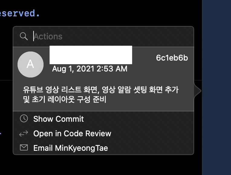 먼저, macOS에서 Xcode를 실행 후 이전 커밋기록을 확인하고 싶은 파일을 연 상태에서 단축키, [Control + Command + Shift + A]를 눌러줍니다. 그렇게 하면 현재 파일의 이전 커밋 기록을 우측 탭으로 확인할 수 있습니다.