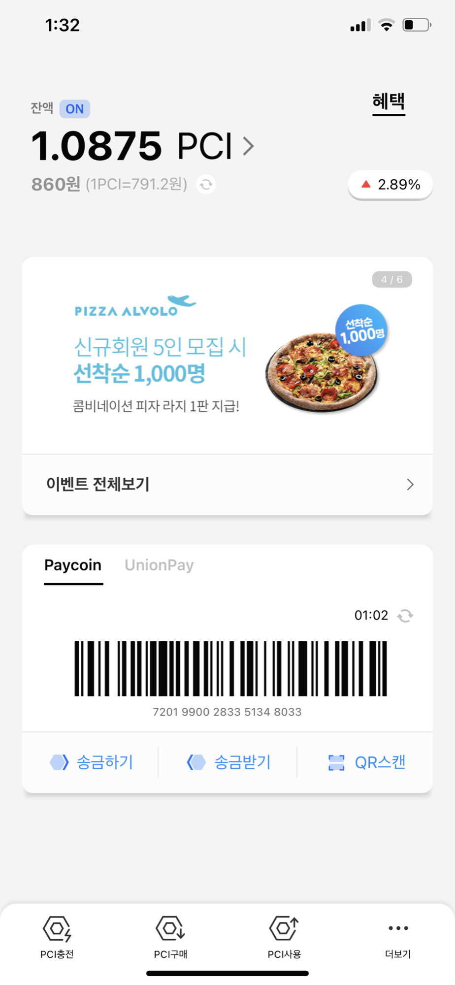 그렇게 업비트에서 PCI, 페이코인 출금을 진행하면 3 ~10분 사이로 페이코인앱에 코인이 입금됩니다. 이렇게 입금한 페이코인앱의 페이코인으로 페이코인 간편결제를 할 수 있게 됩니다. 한번씩 파격적인 이벤트를 하는것으로 보이니, 잘 활용하면 피자나 커피 등의 서비스를 저렴하게 이용할 수 있을 것 같습니다.