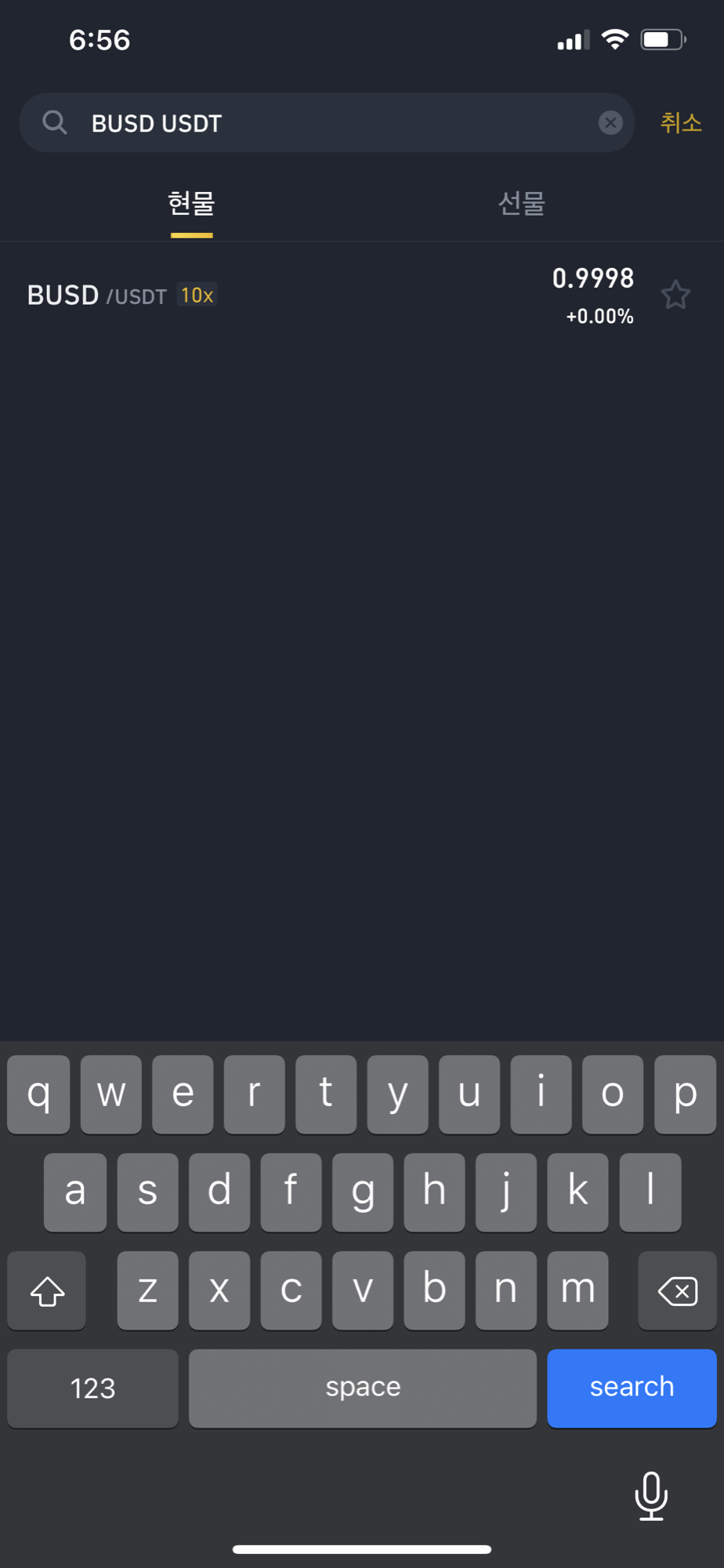 USDT, BUSD 코인을 서로 교환하는 방법은 매우 간단합니다. 먼저, 바이낸스 거래소 앱을 실행 후, 하단의 [시장] 탭을 들어갑니다. 이후 상단 검색창에 "BUSD USDT"를 입력하시면 하나의 거래 종목이 나올겁니다.